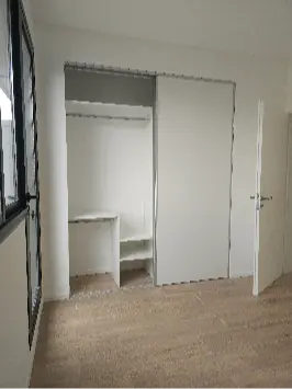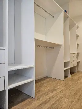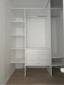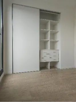 En melamina sobre MDF Puertas sobre guías telescópicas, que deslizan fácilmente y con frente en melamina o espejos de techo a piso, que aportan funcionalidad y amplitud al dormitorio.